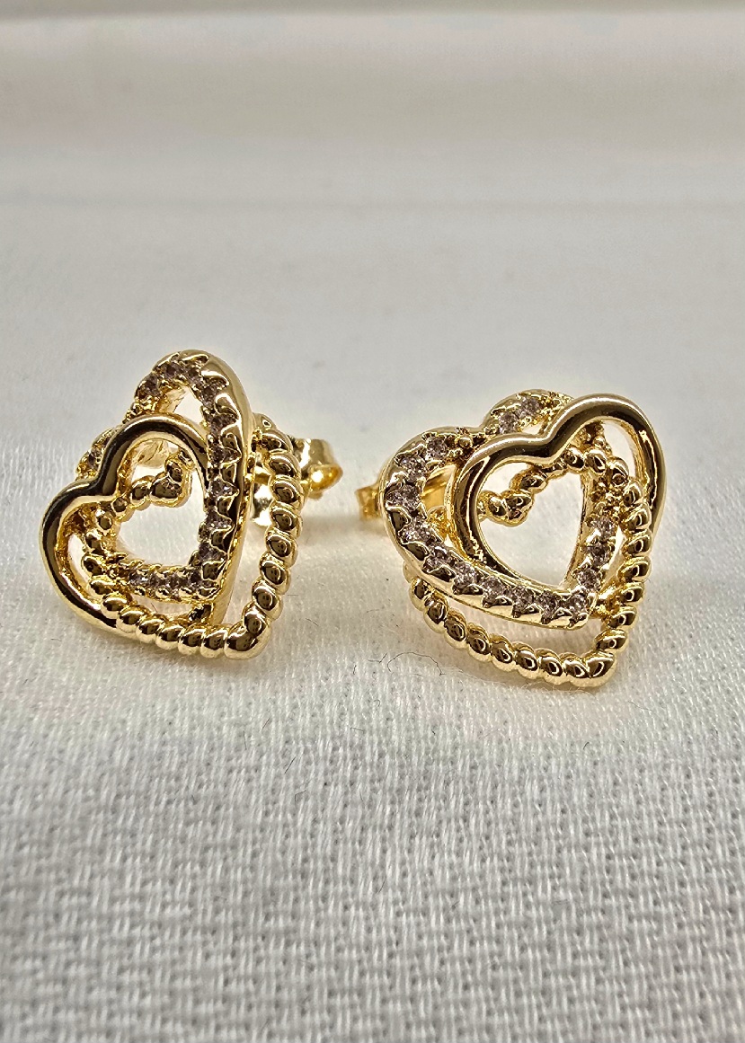 Brinco Dois Corações Cravejado com Zircônias no Banho de Ouro 18k – 1,3 cm