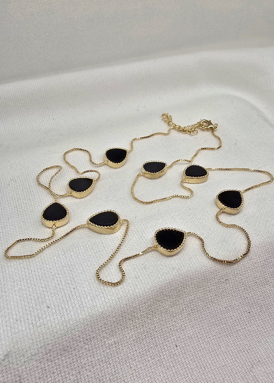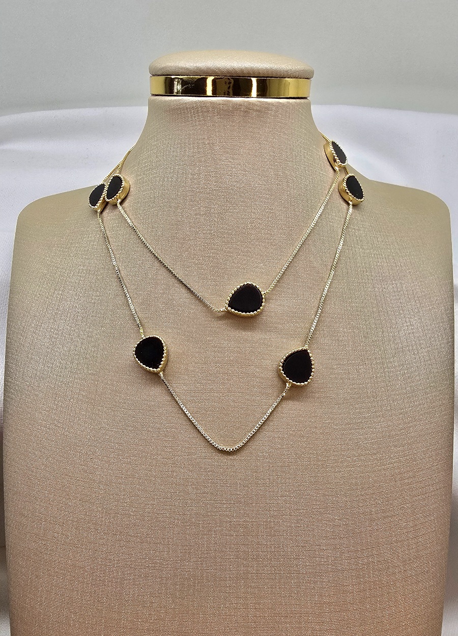 A elegância atemporal da pedra fusion preta em um design sofisticado. Este colar destaca um pingente em formato de gota com lapidação impecável, que traz profundidade e brilho à peça. Disponível em duas versões de comprimento para se adaptar à sua proposta de look.