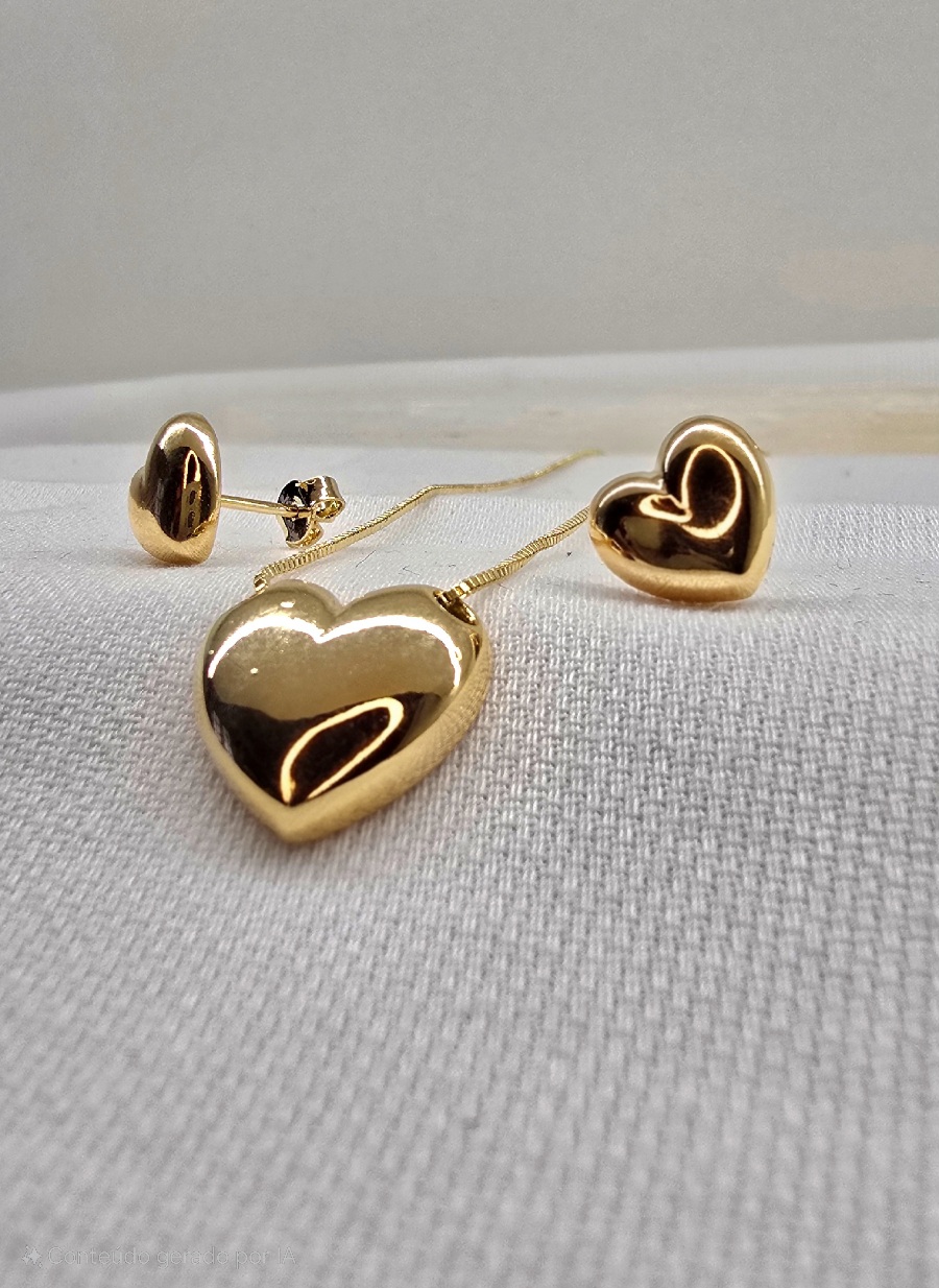 A beleza está na simplicidade. Este conjunto aposta no minimalismo do design “liso”, onde o destaque é o brilho polido e uniforme do Banho de Ouro 18k. Sem pedras, o formato de coração se torna uma peça moderna e versátil, perfeita para composições elegantes e discretas.