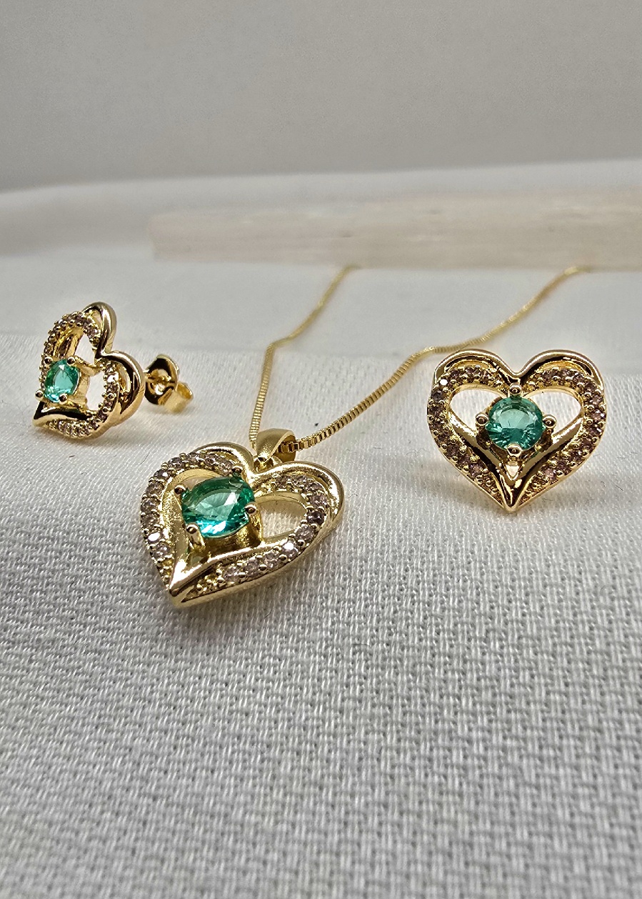 Conjunto coração vazado zirconia verde banho ouro 18k – 45cm