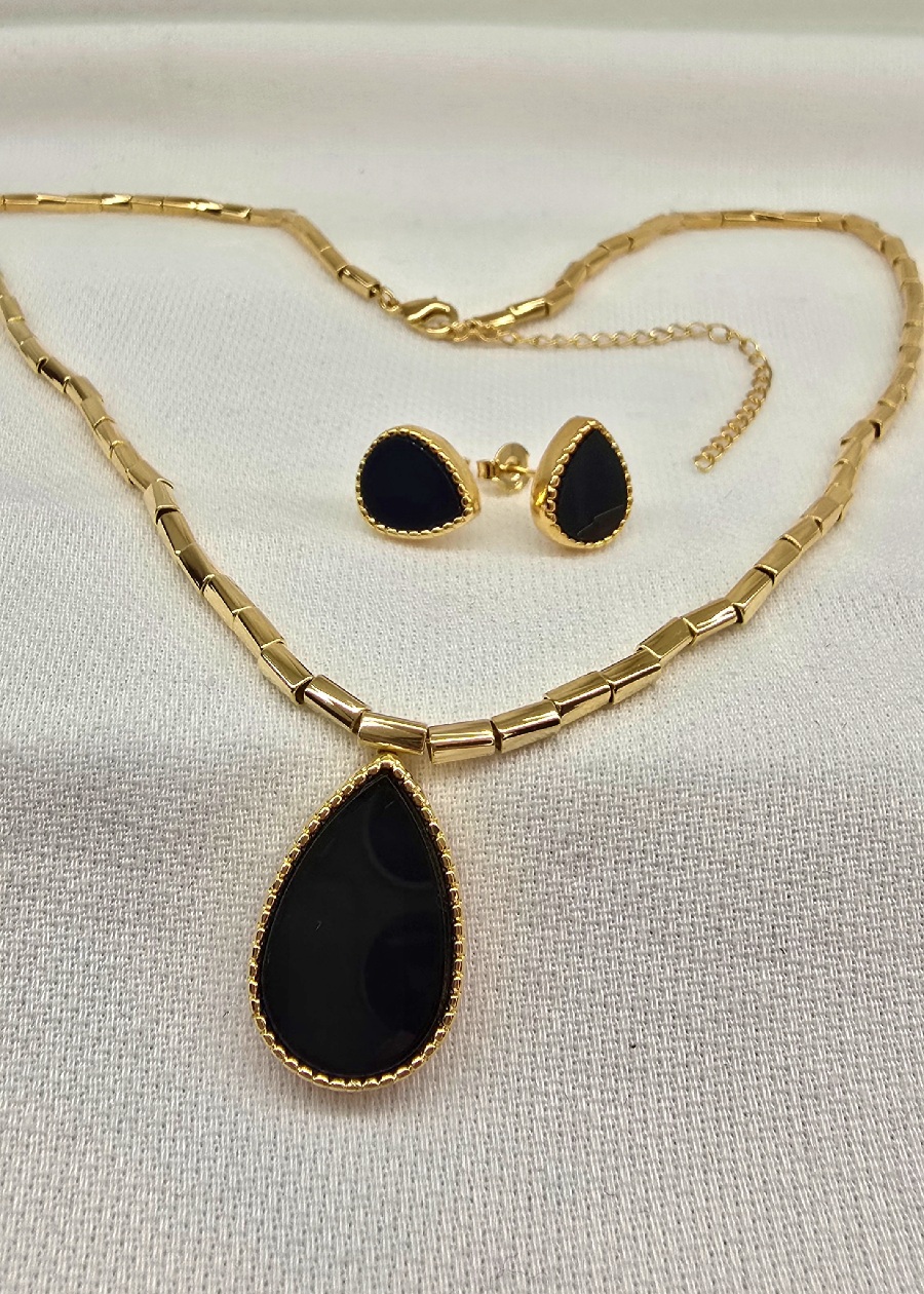 Elegância suprema. Este conjunto Premium traz o clássico formato de gota na cor preta, sinônimo de sofisticação e mistério. O acabamento em Banho de Ouro 18k cria um contraste luxuoso com a pedra escura. Possui o diferencial do extensor de 8cm, permitindo ajustar o comprimento e criar o caimento perfeito para qualquer look.