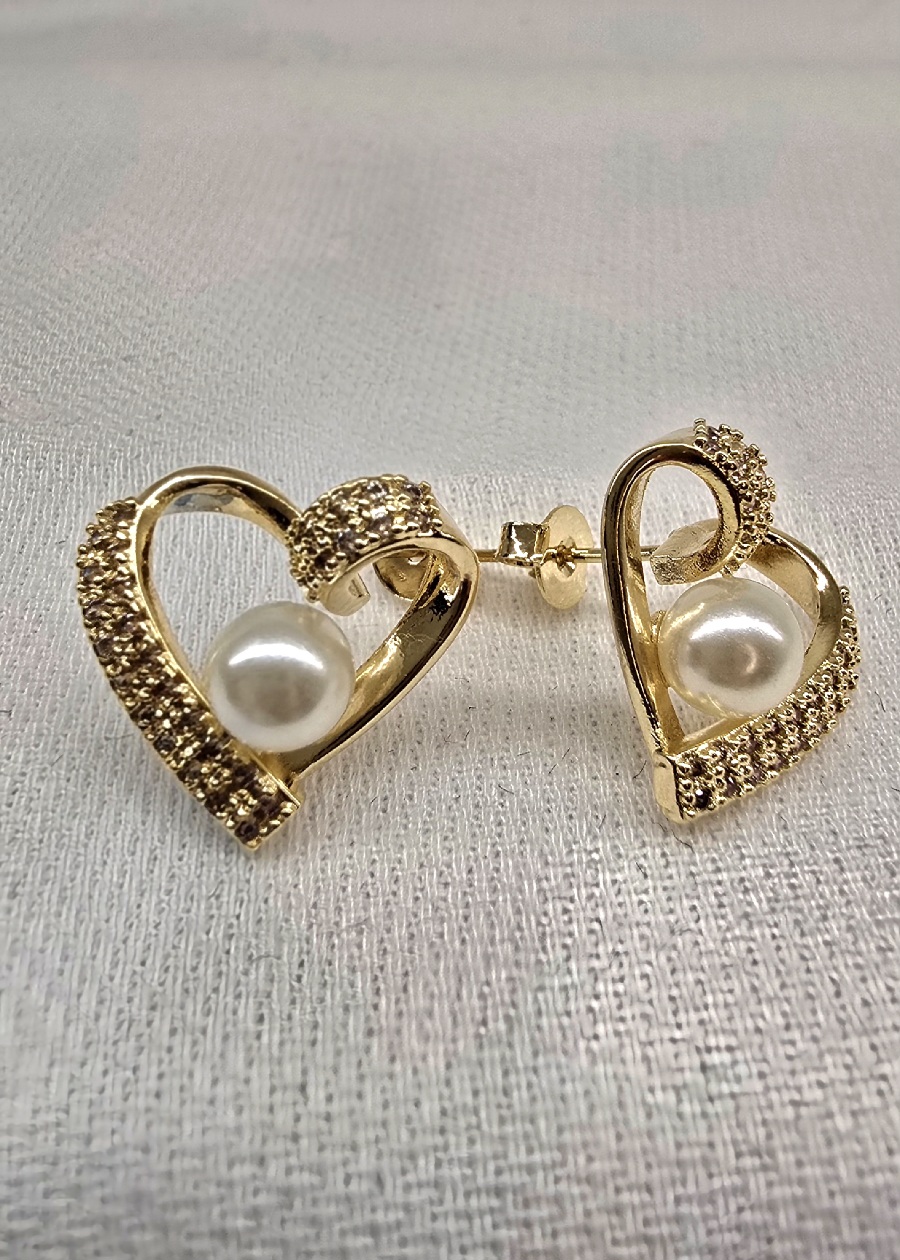 Brinco Coração com Pérola e Zircônia no Banho de Ouro 18k – 1,5 cm