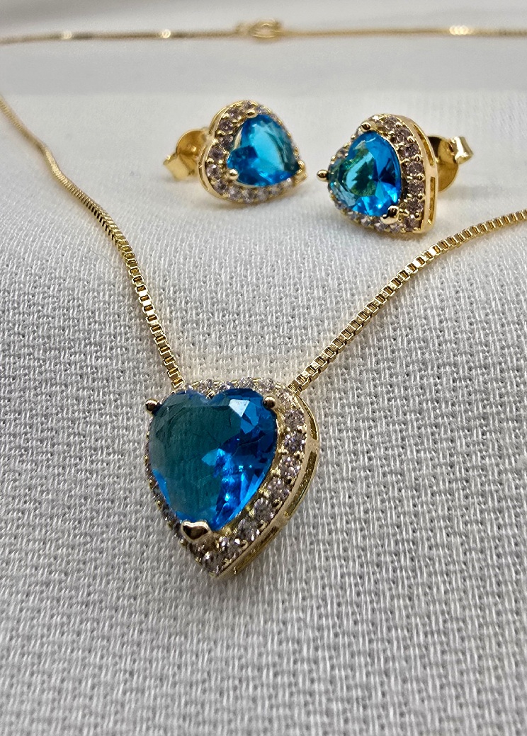 Este conjunto clássico é composto por um colar de 45cm e um par de brincos com pingentes em formato de coração, lapidados em Zircônia de alto brilho. O acabamento em Banho de Ouro 18k garante a durabilidade e o tom dourado luxuoso.